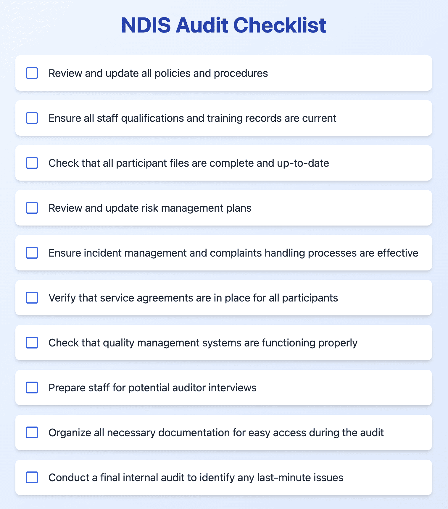 Preparing for an NDIS audit requires thorough planning and organisation. Here's a step-by-step guide to help you get ready: