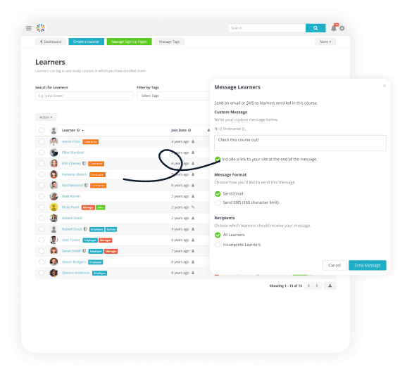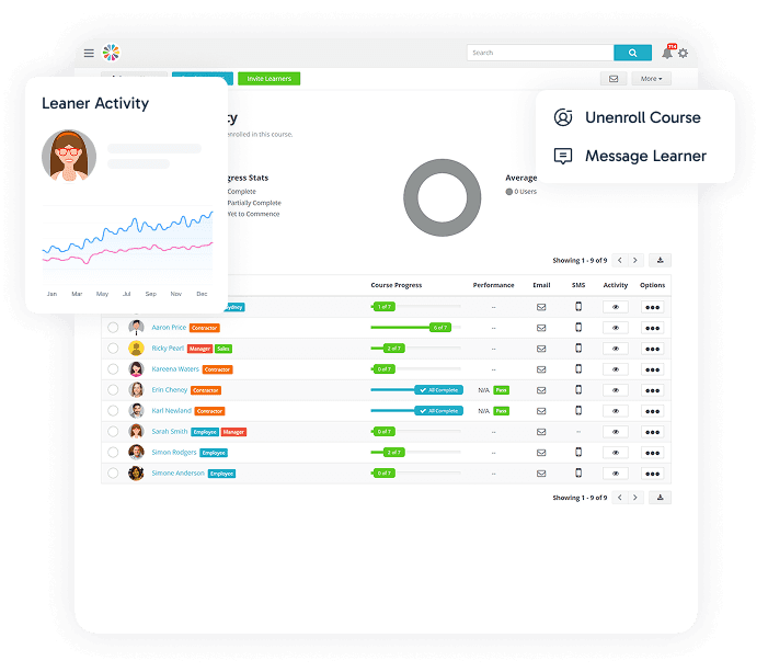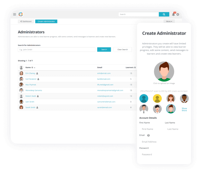 Add administrators to view learner progress, edit some content, send messages to learners and create new learners.